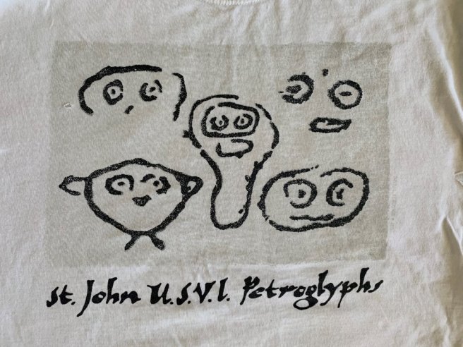 Evidence of art on St. John reaches back into prehistoric times. Art is etched in stone in Reef Bay as petroglyphs. They tell us of the existence and a little bit about a culture that existed at the time. Not only did these ancient artists have the creative imagination, skills and tools to create artwork, the culture also had to have the sufficient surplus time, energy, and resources to make this art possible. A St. John artist, David Ferguson, many, many, many years later copied the images of these petroglyphs and put them on a T-shirt, which I have gladly worn for many years. During the historic period, centuries later, St. John had a very important art form — St. John baskets. They were around long before paper and plastic bags. Baskets are typically thought of as functional items however, some baskets have reached level of high end art.